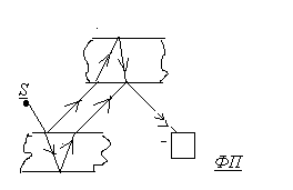 Пластинка Р покрыта полупрозрачным слоем. 1-ый луч проходит пластинку трижды, а 2- ой луч – один раз. Для компенсации этого ставиться пластинка к. Если сместить одно зеркало на Δh, то возникает дополнительная разность хода =2Δh. Интерферометр обладает большой чувствительностью. С его помощью исследовалось влияние движения Земли на скорость света. На нем же сравнивалось длина эталонного метра с длиной световой волны: на 1 м укладывается 1650763,73 длины волны оранжевой спектр, линии криптона. Этим прибором можно измерить длину когерентности перемещая одно из зеркал до исчезновения интерференции. Например, пары кадмия дают излучение с длиной когерентности ~ 20см. С помощью 2-х лучевых интерферометров можно измерить и пространственную когерентность, например в схеме Юнга. Многолучевые интерферометры – используются многократная интерференция нескольких световых лучей, что представляет практические преимущества. В частности, можно создать оптические устройства, пропускающие излучение лишь вблизи строго определенной частоты, т.е. интерференционные светофильтры. Наиболее распространенный интерферометр Фабри-Перо. В частности он применяется в качестве оптического резонатора в лазерах.