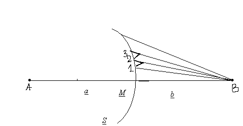 Дифракция света Френеля и Фраунгофера Зоны Френеля. Рассмотрим действия световой волны, испущенной из А в какой-нибудь точке наблюдения В. Согласно принципу Гюйгенса – Френеля заменим действия источника А действием воображаемых источников, расположенных на вспомогательной поверхности S(поверхность фронта волны идущей из А) Вычисления результата интерференции вторичных волн очень упрощается, если для вычисления действия в точке В разбить поверхность S на зоны такого размера, чтобы расстояние от краев зоны отличались на