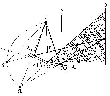 2. Зеркала Френеля. Свет от источника S (рис. 8) падает расходящимся пучком на два плоских зеркала А1О и A2О, расположенных относительно друг друга под углом, лишь немного отличающемся от 1800 (угол j мал).
