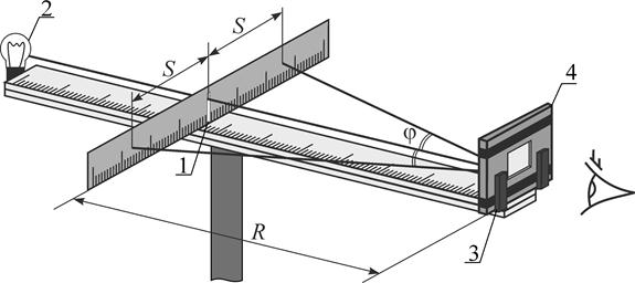 На оптической скамье может передвигаться пластина, в которой прорезана щель 1 прямолинейной формы (рис. 9). На пластине укреплена шкала с делениями. Щель освещается электрической лампочкой 2. Между лампочкой и щелью вставляется монохроматический светофильтр. На другом конце оптической скамьи укреплен держатель 3, в который вставляется дифракционная решетка 4. Если смотреть на освещенную монохроматическим светом щель через дифракционную решетку, то по бокам ее видна дифракционная картина. Пусть каждое боковое дифракционное изображение смещено в сторону на величину S. Из рис. 9 видно, что