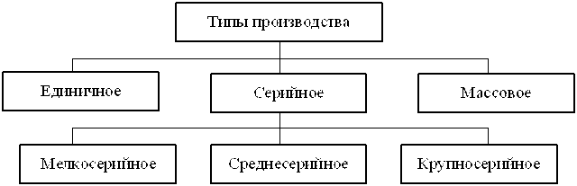 Организация производственных процессов, выбор наиболее рациональных методов подготовки, планирования и контроля за производством во многом определяются типом производства на машиностроительном предприятии, Под типом производства понимается совокупность признаков, определяющих организационно-техническую характеристику производственного процесса, осуществляемого на одном или многих рабочих местах в масштабе участка, цеха, предприятия. Тип производства во многом предопределяете формы специализации и методы организации производственных процессов. В основу классификации типов производства положены | следующие факторы: широта номенклатуры, объем выпуска, степень постоянства номенклатуры, характер загрузки рабочих мест и их специализация. Номенклатура продукции представляет собой число наименований изделий, закрепленных за производственной системой, и характеризует ее специализацию. Чем шире номенклатура, тем менее специализирована система, и, наоборот, чем, она уже, тем выше степень специализации. Широкая номенклатура выпускаемой продукции обусловливает большое разнообразие технологических процессов и операций, оборудования, инструментов, оснастки и профессий рабочих. Объем выпуска изделий ‑ это количество изделий определенного вида, изготавливаемых производственной системой в течение определенного периода времени. Объем выпуска и трудоемкость изделия каждого вида оказывают решающее влияние на характер специализации этой системы. Степень постоянства номенклатуры ‑ это повторяемость изготовления изделия данного вида в последовательные периоды времени. Если в один плановый период времени изделие данного вида выпускается, а в другие ‑ не выпускается, то степень постоянства отсутствует. Регулярное повторение выпуска изделий данного вида является одной из предпосылок обеспечения ритмичности производства. В свою очередь, регулярность зависит от объема выпуска изделий, поскольку большой объем выпуска может быть равномерно распределен на последовательные плановые периоды. Характер загрузки рабочих мест означает закрепление за рабочими местами определенных операций технологического процесса. Если за рабочим местом закреплено минимальное количество операций, то это узкая специализация, а если за рабочим местом закреплено большое количество операций (если станок универсальный), то это означает широкую специализацию. В зависимости от указанных выше факторов различают три типа производственных процессов или три типа производства: единичное, серийное и массовое (рис. 4.2).