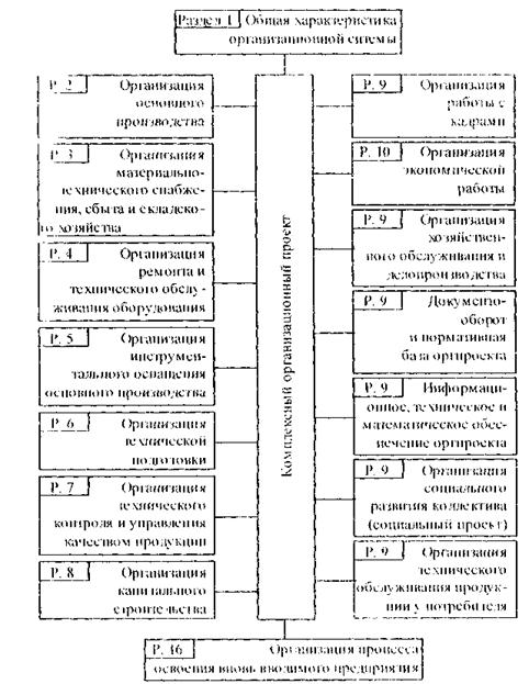 Организационное проектирование комплекс технических, организационных и экономических решений, определяющих строение производственной системы (ее пространственную, временную и организационную структуру), а также программу организации организационных изменений. Цель организационного проектирования разработка новых производственных систем или предложений по совершенствованию организации и управлению производством существующих систем, направленных на существенное улучшение социально-экономических показателей работы предприятия при безусловном выполнении экономических требований к производству. При проектировании производственных систем одновременно разрабатываются и решаются технологические, экономические и организационные задачи. Основные из них: 1. Технологические задачи: определение состава рабочих процессов; выбор технологического процесса и оборудования; определение трудоемкости операций, норм расхода материалов и потребности в площадях; разработка компоновки цехов и планировка участков 2. Экономические задачи: определение себестоимости и рентабельности выпуска изделия; расчет необходимых основных и оборотных фондов; оценка социально-экономической эффективности организационных изменений; инвестиционное обоснование проекта. 3. Организационные задачи: определение принципов построения производственной системы; разработка производственной и организационной структуры; выбор методов организации производства и труда; определение системы оперативного управления производством: установление экономических отношений между участниками производственного процесса подразделениями или отдельными исполнителями. Организационное проектирование осуществляется в четыре этапа: предпроектная подготовка; техническое проектирование; рабочее проектирование; внедрение. Этап I. Предпроектная подготовка связана с разработкой и обоснованием общей концепции организации производства, а также проведения комплексного обследования объекта проектирования. Этап 2. Техническое проектирование ведется на основе утвержденного технического задания. На этом этапе разрабатываются основные положения системы организации производства, принципы ее функционирования, методы сопряжения с другими подсистемами. Этап 3. Рабочее проектирование предполагает детальную разработку организации процессов производства: проведение необходимых инженерных расчетов, составление структурных схем, формирование материальных и информационных потоков, разработку календарно-плановых нормативов организации производства. Этап 4. Внедрение организационного проекта требует обучения и психологической подготовки персонала. На этом этапе вводятся в действие новые инструкции и положения, перестраивается производственная и организационная структуры, внедряются новые методы организации производства и труда. Состав комплексного организационного проекта (оргпроекта) производственной системы это комплект проектной документации, регламентирующий всю совокупность процессов организации производства, труда и управления, разработанный с использованием современных методов проектирования и трудовою опыта, учитывающий требования, предъявляемые к производственной системе, и обеспечивающий ее эффективное функционирование. Исходные 