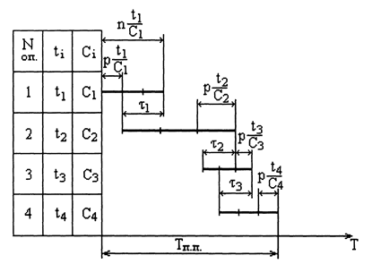 Рис. 5.2.3. Технологический цикл при параллельном виде движения предметов труда по операциям