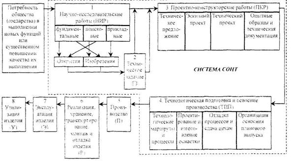 При возникновении потребности общества, государства в выполнении техникой новых функции или в качественно новом уровне их выполнения начинается первый этап жизненного цикла (блок 1) - научно-исследовательские работы (ПИР), которые могут носить фундаментальный, поисковый или прикладной характер. В процессе прохождения этого этапа возникают и проходят всестороннюю проверку новые идеи, реализуемые иногда в виде открытий и изобретении. Изобретение — это результат исследований, реализованный в новом приборе, механизме, инструменте, технологии, методе и прочем, созданном человеком. Открытие — это результат исследований, возможно, побочный. Открытие, а также изобретение делаются, как правило, на фундаментальном уровне и редко изобретателем-одиночкой. Они могут произойти случайно и не преследуют цель получить выгоду. Теоретические предпосылки решения проблем проверяются проведением опытно- экспериментальных работ, которые довольно часто продолжаются одновременно с конструкторскими и технологическими разработками. Начало следующих этапов связано с изучением результатов НИР, патентными исследованиями по отечественным и зарубежным изобретениям, возможностью приобрести необходимые лицензии. Научные исследования, направленные на создание новой техники, подразделяются на фундаментальные, поисковые и прикладные. Фундаментальные исследования – это научные (теоретические и экспериментальные) исследования, расширяющие представления человека о материальном мире, которые дают возможность развития новых видов техники и технологии. По данным исследований, только 5 – 10 % результатов фундаментальных работ реализуются на практике, остальные – пополняют потенциал научных знаний об окружающем мире. Наивысшим достижением фундаментальных исследований является признание их результатов в качестве открытий. Основными направлениями фундаментальных исследований являются: – исследование новых путей развития и совершенствования техники; – открытие новых явлений и закономерностей материального мира; – разработка новых теоретических положений в экономике, организации производства. Поисковые исследования базируются на фундаментальных и позволяют создать новые направления развития техники, обеспечивающие значительное повышение производительности труда и качества выпускаемых изделий, и включает следующие направления: – поиск путей применения новых явлений и закономерностей в технике; – прогнозирование развития техники; – исследование применяемости новых экономических и организационных положений. Прикладные исследования позволяют на основе фундаментальных и поисковых работ решить конкретные научные проблемы, обеспечивающие создание новых изделий и технологий, и включают следующие направления: – разработка новых конструкций машин и приборов; – разработка и совершенствование технологических процессов; – повышение качества, надежности и долговечности машин и приборов; – разработка и совершенствование методов организации труда и производства, техники безопасности на рабочих местах. При проведении научных исследований, наряду с научными задачами, приходится решать ряд организационно-экономических вопросов, связанных с планированием, финансированием и экономическим обоснованием работ. Совокупность работ, 