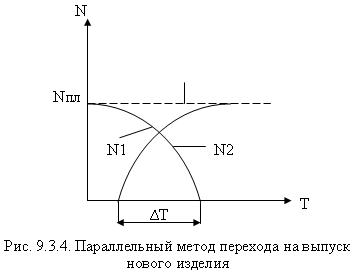 При прерывно-последовательном варианте перехода (рис.9.3.2.) остановка производства на время Недостатком последовательного метода перехода является снижение объема производства до нуля в период освоения выпуска новой продукции. Параллельный метод характеризуется постепенным замещением снимаемой с производства продукции вновь осваиваемой, где одновременно с сокращением объема производства старой продукции происходит наращивание выпуска новой продукции (рис.9.3.4.).