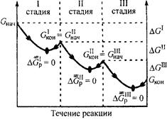 Рис.3. Изменение энергии Гиббса в закрытой системе в обратимой химической реакции (р, Т = const) Химическое и биохимическое равновесное состояние системы характеризуется: - равенством скоростей прямой и обратной реакций ( - энергетической выгодностью ( - отсутствием изменений величин параметров и функций состояния системы: концентрации реагентов, энтальпии, энтропии и энергии Гиббса ((Δ Поскольку в состоянии химического равновесия система достигает минимально возможного значения энергии Гиббса, то реакция, которая приводит в данных условиях к состоянию равновесия, всегда протекает самопроизвольно. Благодаря этой особенности обратимых процессов большинство биохимических реакций, протекающих в организме, обратимы. Другая особенность биохимических процессов, протекающих в организме, заключается в их многостадийности, так как вероятность обратимого протекания отдельной стадии значительно выше, чем всего процесса в целом (рис. 4). Это объясняется тем, что разница между величинами (Gнач и Gкон для каждой отдельной стадии обычно невелика (| ΔGp | < 10 кДж/моль). Обратимость отдельных стадий биохимических процессов позволяет живому организму легко регулировать синтез тех или иных соединений в зависимости от потребности и тем самым поддерживать стационарное состояние. Стационарное состояние для живого организма характеризуется постоянством его термодинамических величин и неизменностью во времени скоростей поступления и удаления веществ и энергии. Несмотря на постоянство термодинамических величин, они не имеют равновесных значений в этом состоянии. Биологическое развитие организма возможно только в системе, находящейся в стационарном состоянии, но далёком от равновесия. Именно стационарное неравновесное состояние живой материи позволяет ей оптимизировать свои характеристики и эволюционировать во времени. Термодинамическая особенность стационарного состояния открытых систем впервые сформулирована И. Р. Пригожиным (1946 г.)*.