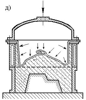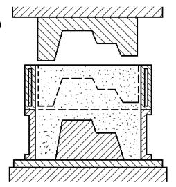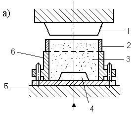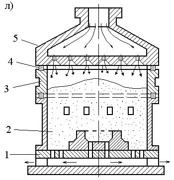 Остальные обозначения: 4 — уплотнения; 3 — наполнительная рамка; 1 — модельная плита с центами — отверстиями для выхода газа из опоки. Принцип импульсного уплотнения реализован в формовочных машинах 20501... 20503; у последней размеры опоки 1000x800, продолжительность цикла 40 с. При гравитационном уплотнении необходимая порция смеси падает на модельную плиту со скоростью 5—7 м/с, что значительно выше, чем при встряхивании, поэтому смесь уплотняется за один удар, но полученная плотность недостаточна для получения качественных отливок, поэтому метод используется только в сочетании с другими. Вакуумно-прессовое уплотнение соединяет прессование с вакуумированием смеси, что приводит к большей равномерности плотности формы, повышению ее прочности, снижению влажности.