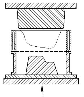 Таким образом, в зоне модели плотность наименьшая. Поэтому верхнее прессование применяют для опок высотой не более 200—250 мм. Габаритные размеры опок ограничиваются усилием прессования, которое может развить машина. Уплотнение прессованием отличается малошумностью и высокой производительностью, так как вместо ударов при встряхивании требуется только один ход поршня. Применение вибрации во время прессования (вибропрессование) уменьшает потребное усилие и увеличивает равномерность уплотнения. При нижнем прессовании (рис. 3.14) в роли прессующей колодки выступает модельная плита 4, что обеспечивает в зоне модели наибольшую плотность смеси.
