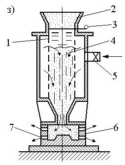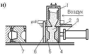 Смесь 4 из питателя 2 через шибер (заслонку) 3 подается в резервуар /. Затем шибер закрывается, и через клапан 5 в резервуар подается мощный поток сжатого воздуха под давлением 0,6 МПа, выстреливающий смесь в стержневой ящик 6 или опоку, прижатую к дутьевой плите пескодувной головки. Выпуск воздуха из ящика или опоки наружу происходит через вентиляционные отверстия, или венты 7. Процесс может быть выполнен в пескодувном и пескострельном (см рис. 3.20) режимах. Пескодувно-прессовое уплотнение (рис. 3.21) применяется, например, при безопочной формовке в горизонтальную стопку.