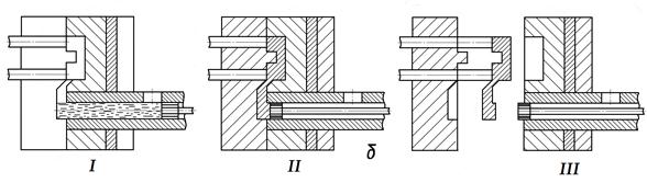 Литье под давлением — наиболее производительный способ из-товления относительно небольших отливок из цветных сплавов с высокой точностью по размерам и чистотой поверхности. Отливки получают в стальных пресс-формах. Расплавленный сплав заполняет пресс-форму под давлением поршня до 300 МН/м2 (3000 кгс/см2), быстро затвердевает и образует отливку. Затем пресс-форма раскрывается, готовая отливка удаляется толкателями. Литье под давлением осуществляют на компрессорных и поршневых машинах высокой производительности, дающих 200...400 отливок в час. Поршневые машины выпускают с горячей или холодной камерой сжатия, расположенной горизонтально или вертикально. Машины с горячей камерой сжатия, в которых камера находится непосредственно в расплаве, применяют для получения отливок из сплавов с низкой температурой плавления на основе цинка, олова и свинца. Машины с холодной камерой сжатия, в которых камера вынесена за пределы расплава, используют для получения отливок из более тугоплавких цветных сплавов на основе алюминия и магния. На поршневых машинах с вертикальной холодной камерой прессования (рис. 2, а) расплав 4 заливают в камеру сжатия 5 (положение I). Верхний поршень 1, опускаясь, давит на расплав и на нижний поршень 10, который при движении вниз открывает литниковый канал 3. Металл заполняет полость 2 пресс-формы, состоящей из двух половин 6 и 7 (положение II). Объем жидкого металла должен быть больше объема полости формы, чтобы между верхним и нижним поршнем оставался избыток металла. Давление верхнего поршня поддерживают до полной кристаллизации отливки, после чего пресс-форму раскрывают и отливку 9 вместе с литником 12 выталкивают из формы толкателями 8. Нижний поршень выталкивает наружу избыток металла 11 (положение III), и его отправляют в переплав. Поршневые машины с холодной камерой прессования применяют для получения отливок из латуней, алюминиевых, магниевых и других цветных сплавов, а также стальных отливок. В отечественном литейном производстве все большее распространение получают машины с горизонтальной камерой прессования. В этих машинах меньше охлаждение жидкого металла и его гидравлическое сопротивление при заполнении формы. Машины имеют на 10—20% более высокую производительность, проще в обслуживании. Поршневые машины с холодной камерой прессования применяют для получения отливок из латуней, алюминиевых, магниевых и других цветных сплавов, а также стальных отливок. В отечественном литейном производстве все большее распространение получают машины с горизонтальной камерой прессования. В этих машинах меньше охлаждение жидкого металла в его гидравлическое сопротивление при заполнении формы. Машины имеют на 10—20% более высокую производительность, проще в обслуживании. На (рис. 2, б) показана работа машины с горизонтальной холодной камерой прессования. Все операции на ней выполняются в той же последовательности. На (рис. 2, в) приведена схема работы поршневой машины с горячей камерой прессования. Чугунный тигель 13 с жидким металлом все время подогревают снизу газом через форсунку 21. Перед заливкой пресс-форму 19 закрывают, и мундштук 18 соединяется с каналом 17. При верхнем положении поршня 16 через отверстие 14 сплав заполняет камеру сжатия 15 и канал. При движении вниз поршень впрессовывает жидкий металл в полость формы. После з