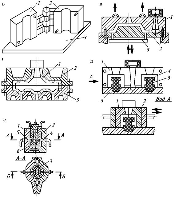 Литье в металлические формы (кокили) Металлические формы — кокили являются литейными формами многократного использования. Их изготавливают из стали, чугуна и алюминиевых сплавов. По конструкции металлические формы бывают неразъемные и разъемные. Вытряхные кокили применяют для отливок, конструкция которых обеспечивает свободное удаление их из формы вместе с литниковой системой при повороте формы на 180°. Разъемные кокили делают створчатыми (рис. 1, б), с горизонтальной плоскостью разъема (рис. 1, в) и с вертикальной плоскостью разъема (рис. 1, д, е) и более сложных конструкций. Внутренняя полость кокиля (рабочая поверхность) оформляет наружную конфигурацию отливки. Отверстия, пазы и полости в отливке выполняются при помощи стержней — обычных песчаных или металлических. При этом конструкция металлических стержней должна обеспечивать их свободное извлечение из формы после затвердевания отливки. Для того чтобы можно было извлечь сложный металлический стержень 3 (рис. 1, е), его делают составным — из трех частей. Металлическая форма не обладает газопроницаемостью, поэтому конструкция формы должна обеспечивать удаление воздуха и газов при ее заливке. В форме наряду с выпорами предусматривают вентиляционные пробки (венты) и тонкие риски по плоскости разъема. Металлическая форма неподатлива и оказывает сопротивление усадке отливки при затвердевании. Это затрудняет извлечение отливки из формы. Поэтому в кокилях часто предусматривают толкатели (рис.1, е). Перед заливкой в кокиль металла рабочую поверхность кокиля окрашивают тонким слоем огнеупорной краски. Краска защищает поверхность кокиля от непосредственного контакта с жидким металлом и тем самым уменьшает износ формы. Кроме того, толщиной слоя краски можно регулировать интенсивность охлаждения отливки, так как краска менее теплопроводна, чем металлический кокиль. Окраску производят несколько раз в смену. Полости литниковой системы, прибылей, выпоров облицовывают теплоизоляционным материалом (например, асбестом) и окрашивают более толстым слоем краски. Металл в этих каналах будет затвердевать в последнюю очередь. Перед началом работы кокили подогревают до температуры 200—300 °С. Если перед заливкой металла форма будет холодной, то из-за большой теплопроводности формы металл потеряет жндкотекучесть раньше, чем заполнит форму. К тому же при заливке в неподогретый кокиль его поверхность при контакте с жидким металлом испытывает «термоудар», что увеличивает износ формы. Стойкость металлической формы зависит от ее материала, температуры заливаемого сплава и массы отливки. Наименьшую стойкость имеют кокили при заливке стали 10—50 шт. при производстве крупных отливок и 400—600 шт. — мелких. При литье алюминиевых, магниевых и цинковых сплавов в кокиле можно получить от нескольких тысяч до сотен тысяч отливок.