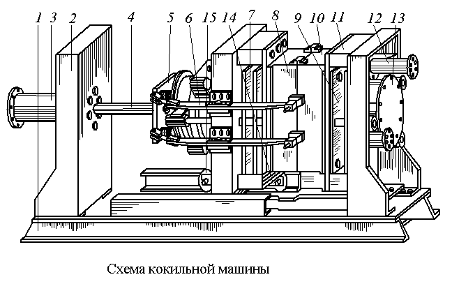 Кокильный станок Металлические формы устанавливают на кокильных станках или механизированных кокильных машинах, которые имеют механический, пневматический или гидравлический приводы. Привод осуществляет закрывание, раскрывание, кантование кокиля, извлечение металлических стержней и выталкивание отливки. На рис. 1 показан общий вид кокильной машины конструкции МВТУ им. Баумана. На раме / установлены две стойки 2 с пневмоцилиндрами 3 и 12. Неподвижная полуформа 10 прикреплена к плите стойки, а подвижная полуформа 8 смонтирована на стойке тележки 14, которая штоком 4 передвигается по швеллерам-рельсам 15. Металлическая форма запирается пневморычажным механизмом 6. Отрыв кокиля и металлических стержней от отливки осуществляется усилителями 5 и 13. Выталкиватели устанавливают на плите //, а стержни — на плитах 7 и 9.