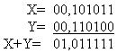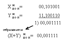 При переполнении разрядной сетки, происходит перенос единицы в знаковый разряд. Это приводит к неправильному результату, причем положительное число, получившееся в результате арифметической операции может восприниматься как отрицательное (так как в знаковом разряде "1") и наоборот. Например: Здесь X и Y - коды положительных чисел, но ЭВМ воспринимает результат их сложения как код отрицательного числа ("1" в знаковом разряде). Для обнаружения переполнения разрядной сетки вводятся модифицированные коды. В модифицированном обратном и модифицированном дополнительном кодах под знак числа отводится не один, а два разряда: "00" соответствует знаку "+", "11" - знаку "-". Любая другая комбинация ("01" или "10"), получившаяся в знаковых разрядах служит признаком переполнения разрядной сетки. Сложение чисел в модифицированных кодах ничем не отличается от сложения в обычных обратном и дополнительном кодах. Рассмотрим предыдущий пример, выполнив сложение в модифицированном обратном коде: