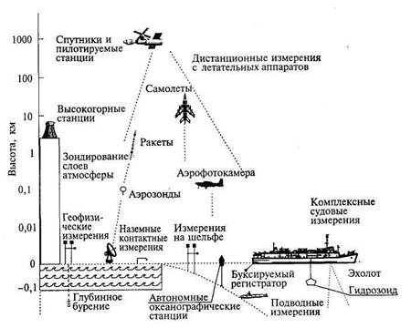 Рис. 2.1. Организация измерений свойств географической оболочки Надежность (качество) информации зависит от ряда факторов: надежности исполнителей (наблюдателей), парка и свойства используемых технических средств регистрации и обработки данных (в последнем случае — от характера используемых программ обработки), методов работы (технологии преобразования и применения информации), организации наблюдений (измерений), сбора, систематизации и хранения данных. Критериями надежности служат полнота, точность и достоверность информации. Полнота напрямую зависит от пространственной и временной плотности (густоты) точек измерений (наблюдений). Она определяется размещением пунктов сбора информации и дискретностью измерений. Результаты (например, гидрометеорологические наблюдения с дискретностью в 3 часа) составляют временные ряды, позволяющие судить о состоянии нашей планеты не только в текущий момент в определенном месте, но и в прошлом. Точность информации подразумевает точность пространственного положения точек наблюдения и погрешность определения физической величины. Точность во многом зависит от средства регистрации (измерительного прибора и др.). Достоверность означает отсутствие дезинформации, которая может быть субъективной (перепутывание объектов, событий, величин, их неправильное толкование) и объективной, полученной в результате эксперимента или моделирования, когда исследование базируется на недостоверных данных. Отсюда известное всем географам правило — «пишу, что вижу». Один из путей повышения надежности — дублирование источников информации. Релевантность рассматривается как пригодность данных к решению конкретной задачи. Кондиционность информации означает ее соответствие заданию, которое было составлено в начале наблюдений или эксперимента и где была указана номенклатура необходимых данных. Со временем сложилась определенная система сбора информации, составляющая основу общих методов изучения географической оболочки. По способу получения информации выделяют экспериментальные и теоретические методы, по месту наблюдения — полевые и камеральные, по используемой технике — визуальные и инструментальные, по характеру информации — количественные и качественные. Особое положение занимают лабораторные методы исследования, включающие работу с пробами в стационарных условиях. Получение информации возможно при непосредственном контакте исследователя с объектом в ходе наблюдений и экспериментов. Наблюдения. Следует различать понятия «наблюдение» и «измерение». Наблюдение с древних времен было первоисточником знаний об окружающем мире. Оно дает сведения о географическом объекте в природной среде. К таким объектам относятся радуга, извержение вулкана и другие, свойства которых мы наблюдаем. Но поскольку все географические объекты материальны, они обладают определенным набором физических свойств (параметров), которые измеряют инструментальными средствами. Основные параметры географических объектов общеизвестны: температура, давление, скорость звука и др. В основе измерений лежат физические законы. Среди измерений выделяют контактные и бесконтактные (рис. 2.1). К контактным относятся измерения, при которых измеритель непосредственно контактирует с измеряемым объектом (например, измерение 