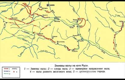 Но при князе Владимире Святославиче — крестителе (956 — 1015) — уже во всю полыхали княжеские усобицы. Поэтому, как в условиях усобиц можно было собрать трудовые и продовольственные ресурсы для строительства валов и держать на них, пусть и не на всей их протяжённости, но хотя бы в «укрепрайонах» гарнизоны «сил быстрого реагирования», — это выше нашего понимания. Что касается легенды о происхождении Змиевых валов, то БСЭ в данном вопросе приводит неточную версию. Дело в том, что змия богатырь как раз и не победил, но в ходе поединка стороны выявили примерное равенство сил. И в передышке поединка змий предложил сговор: поделить Землю пополам, и провести границу владений змия и богатыря. Богатырь предложение как бы принял, выразив согласие, сделал соху громадных размеров, змий впрягся в соху, и они начали пропахивать границу владений. Когда змий от этой пахоты подустал, богатырь предложил не только землю, но и море поделить. Змий согласился, богатырь направил соху в Чёрное море, где обессиленного змия и утопил. Ну а Змиевы валы́ — остатки той борозды (так суть легенды помнится с детства). В другой версии легенды дело происходило иначе: «Сказывают, будто во времена древние-незапамятные, егда ещё не все Светлые Боги народились у Сварога-Отца да Лады-Матушки, егда Земля была ещё молода и люди только-только населили её, повадился тогда Змей с людей дань красными девицами брать. Увидал Сварог, что тако Правь Божская нарушается, взял в длань Свой Молот тяжкий, да и хотел, было, Змея того прибить, однако укрылся Змей во своём чертоге. И стал тогда Сварог змеиный чертог Молотом сокрушать. Увидев то, вышел Змей со Сварогом во чисто поле биться-ратиться. Долго ли, коротко бились они, а только повалил Сварог Змея, и хотел уж было сгубить насовсем его Своим Молотом, да только взмолился Змей: “Не бей меня до смерти, Сварог! Бо зрю — сильнее нас с тобой нет никого во всём Всемирьи; разделим же Свет поровну — ты будешь жить в одной половине, а я — в другой”. “Будь по сему, — отвечал Сварог, — для того надобно межу проложить”. Сотворил Сварог во Кузне своей соху во триста пуд, впряг в неё Змея, да и провёл борозду вельми длинную — до самого до виднокрая. “Разделили мы Землю, — речет Змей, — давай теперь и Море делить. А то скажешь, что я твою воду беру”. Согласился на то Сварог. Выплыл Змей на середину Моря, да и занырнул на самую глубину его. Сколько не ударял Сварог по водной глубине своим Молотом, а так и не смог Змея до смерти изгубить. Змей же донырнул до самого Дна Морского, да и остался там. С тех пор царствует Сварог в Небесной Вышине, а Змей — во Морской Глубине (а ещё рекут, что и в Подземьи тоже). Борозда же та, кою Сварог проложил, видна и до сей поры, а кто не знает, отчего эта борозда появилась, называют её “валом”...» (приведено по публикации в интернете, адрес по состоянию на декабрь 2006 г.: http://plamyasvargi.narod.ru/html/spravki/Tolkovnik.htm). Эта версия, на наш взгляд, печально бесперспективна для приверженцев возрождения ведической культуры в современности и их последователей — так называемых «неоязычников», — поскольку: · по существу змий в ней обманывает Сварога, — одного из богов древнеславянского пантеона, — чем и спасает свою жизнь; · нравственность Сварога в этой редакции — какая-то не русская — соглашательская со Злом не в ущерб своекорыстию, да и умом он не вышел и ведё