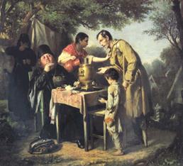 Поведение животных двухаспектно: · с одной стороны оно ориентировано на получение удовольствия, главным образом физиологического характера и отчасти — психоэмоционального; · с другой стороны оно ориентировано на то, чтобы избежать неприятностей, главным образом — боли и отчасти — психоэмоциональных. В любом из вариантов поведение животного строится на основе врождённых инстинктивных программ и их надстроечных оболочек, выражающих индивидуальный и коллективный опыт взаимодействия со средой обитания популяции, в состав которой входит особь. Издревле для человека почиталось предосудительным следовать этой двухаспектности поведения животных. Все исторически устойчивые в преемственности поколений общества (и соответственно — их культуры) издревле, ещё со времён каменного века, требовали от своих членов быть выше этой двухаспектности животного поведения: · С одной стороны — они требовали, чтобы в поведении их полноправных членов выражалась осмысленная воля, ориентированная на достижение той или иной пользы для общества; воля, способная к самопожертвованию в каких-то чрезвычайных обстоятельствах. · И с другой стороны — чтобы при этом люди принимали на себя нравственно-этический долг оказания разносторонней поддержки как выжившим героям (если те утрачивали здоровье и трудоспособность), так и близким погибших, оставшимся без попечения.[265] Проявление именно этих качеств представляет собой — честь [266]. В историческом прошлом: Отказ от требования быть выше свойственной животным двухаспектности поведения и сопутствующего ему нравственно-этического долга всех членов общества становился первым открытым выражением уже свершившегося нравственного разложения общества, которое влёкло за собой социальную катастрофу, наступавшую в течение жизни одного — четырёх поколений, если общество не отказывалось от такого рода нравственно-этической животно-демонической распущенности. В этой связи приведём картину В.Г. Перова «Чаепитие в Мытищах, близ Москвы» (ниже по тексту на следующей странице), написанную им в 1862 г. — спустя 7 лет после завершения второй мировой войны XIX века, обычно называемой «крымской» вопреки её характеру и географии боевых действий. Картина явно не клеветническая (иначе 1917 г. был бы невозможен), хотя можно допустить, что такого рода нравственность и выражающая её этика, характерные для жизни России тех лет, в сюжете картины доведены до степени выражения, близкой к предельной. Но та же порочная нравственность, реализуется и в наши дни в других жизненных сюжетах — как в личностных взаимоотношениях, так и в отношении государственных институтов (включая и службы соцобеспечения) к героям, потерявшим здоровье и в большей или меньшей мере трудоспособность именно вследствие того, что они жертвовали собой…