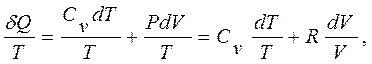 Кроме того, поскольку искомая функция должна быть функцией состояния и принимать прежнее значение при завершении цикла, то ее малое изменение должно быть полным дифференциалом (математическое требование, чтобы интеграл от такого дифференциала по замкнутому пути давал нуль). Малое количество теплоты dQ полным дифференциалом не является, так как зависит от вида процесса, в котором совершается передача теплоты. Для получения из dQ полного дифференциала следует воспользоваться известной в математике процедурой нахождения интегрирующего множителя. Сохранение приведенной теплоты подсказывает, что таким множителем может быть обратная абсолютная температура. Первое начало термодинамики (2.2) dQ = dU + dA для газа в форме dQ = CvdT + РdV и уравнение состояния идеального газа РV = RT позволяют убедиться, что это действительно так, что dQ/Т является полным дифференциалом, так как очевидно, что справа стоит полный дифференциал функции двух переменных. Гениальность Клаузиуса проявилась в том, что он увидел связь между изменением искомой функции состояния (изменением энтропии S) и поступлением в термодинамическую систему теплоты (то есть энергии, передаваемой через хаотическое движение микрочастиц). По Клаузиусу, это изменение определяется дифференциальным соотношением
