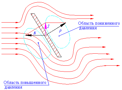 Лопатка стоит на пути движения воздуха, когда поток сталкивается с лопаткой, он тормозится и изменяет направление движения, обтекая лопатку, как показано на (рисунке 2). При этом неизбежно около передней поверхности лопатки возникает область с повышенным давлением воздуха, а около задней поверхности возникает область с пониженным давлением. Величина разницы давлений dP зависит от многих параметров, например скорости движения воздуха, угла атаки, формы поверхности. Из-за разности давлений на поверхностях на лопатку начинает действовать сила P, направленная по нормали к ее плоскости. Поскольку лопатка жестко закреплена на роторе и не может совершать осевые перемещения на нее действует сила реакции N, направленная по оси ротора в сторону противоположную движению потока. Суммарной силой при сложения этих двух сил является сила S направленная перпендикулярно оси ротора. Поскольку это сила приложена к лопатке, то возникает крутящий момент, который заставляет ротор вращаться. Связанный с ротором механизм выполняет полезную работу. В случае ветряной мельницы перепад давления на лопатке не большой и для увеличения силы Р увеличивают площадь, поскольку сила Р = dP x А, где: dP – средней перепад давления; А - площадь лопатки. Другим способом увеличить силу Р, а значит и полезную работу всей установки, это увеличить перепад давления dP. В турбине, где средой вращающей лопатки с ротором, является пар при давлении около 60 атмосфер на входе и 0.04 атмосферы на выходе, перепад настолько большой, что для увеличения общей мощности используют не один ряд лопаток а несколько расположенных друг за другом, на одном роторе. Один круговой ряд лопаток называется ступень расширения (или ступень давления). Когда говорят о том, что турбина имеет пять ступеней давления это значит что, на роторе данной турбины находятся пять круговых рядов лопаток, через которые последовательно проходит рабочие тело. Лопатки которые закреплены на роторе и передают вращающий момент, называются рабочими лопатками они вращаются вместе с ротором.