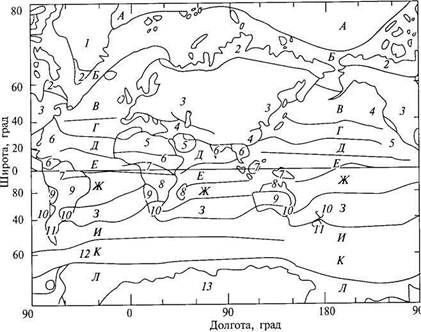 Рис. 6.1. Географическая поясность земного шара (по Д.В. Богданову): пояса океана: А — полярный арктический; Б — субполярный субарктический; В — умеренный; Г — субтропический; Д — тропический пассатный; Е — экваториальный; Ж — тропический пассатный; 3 — субтропический; И — умеренный; К — субполярный субантарктический; Л — полярный антарктический; пояса суши: 1 — арктический (ледовая пустыня); 2 — субарктический (тундра, лесотундра); 3 — у меренный (тайга, листопадные леса, степь); 4 — субтропический (сухие средиземноморские и влажные субтропики, субтропики, полупустыни, пустыни); 5 — тропический (пустыни); 6 — субэкваториальный (листопадные леса, саванны, редколесья); 7 — экваториальный (вечнозеленые, дождевые леса); 8 — субэкваториальный (влажные саванны, сухие леса, редколесья); 9 — тропический (пустыни, сухие и влажные саванны, редколесья); 10 — субтропический (сухие и влажные субтропики); 11 — умеренный (в основном безлесный); 12 — субполярный; 13 — ледниковый (Антарктида) В пределах географических поясов выделяют географические, или ландшафтные зоны, которые характеризуются господством одного зонального типа ландшафта. Зоны в меньшей степени, чем пояса, имеют широтную ориентацию и протяженность, так как условия увлажнения обусловлены не только климатическими факторами, но и структурой самого ландшафта. Ландшафтными географические зоны впервые назвал Л.С. Берг, утверждавший, что их границы подвижны, т. е. с течением времени меняют свое положение на земной поверхности. Причиной такого перемещения он считал коренные изменения климата в прошлом. Изменения, связанные с перемещением зон, охватывают кору выветривания, почвы, растительность и животный мир и естественно меняют облик ландшафта. Палеогеографические исследования подтверждают факт смещения ландшафтных зон в ходе геологического времени и климатическую обусловленность их формирования и подвижности. К.К.Марков, исследуя историю географической зональности, установил два типа зональности, которые сменяли друг друга во времени. В геологические эпохи, когда средняя температура земной поверхности была сравнительно высокой, формировалась простая, обычно субширотная зональность с сильным развитием тропических областей. В холодные периоды общее число географических зон и поясов увеличивалось, внутритропическое пространство сужалось, границы поясов и зон сдвигались в сторону от экватора, за счет чего расширялись внетропические пространства. Современная поясно-зональная структура земной поверхности дает основание полагать, что Земля еще переживает холодный период с сохранением ледниковых покровов, поскольку ледники свойственны не только полярным областям, но и высокогорьям всего земного шара. Периодический закон географической зональности. Климатические условия географических поясов и зон можно оценить с помощью показателей: коэффициента увлажнения Высоцкого—Иванова к = Х/Е0 (где X— годовая сумма осадков, мм; Е0 — годовая испаряемость, мм) и радиационного индекса сухости Будыко r= R/LX ( где R — годовой радиационный баланс; LX— энергия, которая потребовалась бы на испарение выпадающих атмосферных осадков). Значения показателей определяют характер увлажненности ландшафтов: аридный (засушливый) или гумидный (влажный). Чтобы отобразить влияние ландшафтных условий на увлаж