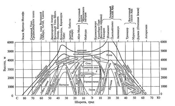 Рис. 6.4. Структура вертикальной поясности ландшафтов в континентальных секторах материков (по А. М. Рябчикову): 1 - ландшафты листопадно-вечнозеленых субэкваториальных лесов; 2 - ландшафты муссонных лесов