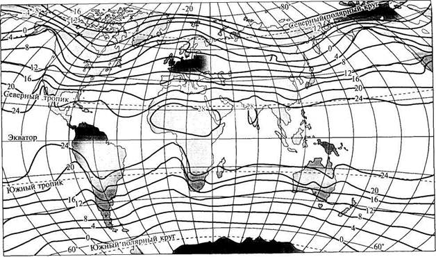 Рис. 7.5. Распределение среднегодовой температуры воздуха на земной поверхности, °С (С.Г.Любушкина, К.В.Пашканг, 2002) Нарушение плотностной стратификации, особенно в таких подвижных геосферах, как атмосфера и гидросфера, обусловливает движение воздуха и воды в вертикальном и горизонтальном направлениях. Усиление или ослабление этого процесса приводят к перераспределению тепла (выравниванию, понижению или повышению температуры), появлению или размыванию слоистости воздушных и водных масс.