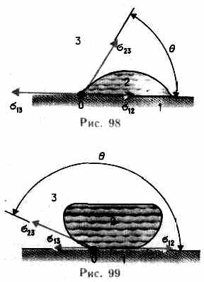 Из практики известно, что капля воды растекается на стекле и принимает форму, изображенную на рис. 98, в то время как ртуть на той же поверхности превращается в несколько сплюснутую каплю (рис. 99). В первом случае говорят, что жидкость смачивает твердую поверхность, во втором — не смачивает ее. Смачивание зависит от характера сил, действующих между молекулами поверхностных слоев соприкасающихся сред. Для смачивающей жидкости силы притяжения между молекулами жидкости и твердого тела больше, чем между молекулами самой жидкости, и жидкость стремится увеличить поверхность соприкосновения с твердым телом. Для несмачивающей жидкости силы притяжения между молекулами жидкости и твердого тела меньше, чем между молекулами жидкости, и жидкость стремится уменьшить поверхность своего соприкосновения с твердым телом.