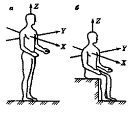 По направлению действия локальная вибрация подразделяется на действующую вдоль осей ортогональной системы координат Хр, Ур, Zp, в которой ось