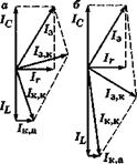 /к к — общий ток компенсирующей катушки емкости Сь и Сс (проводимости gb и gc). Этот ток /3 имеет две составляющие — активную /г и емкостную Iс (рис. 16.26, б). На векторной диаграмме рис. 16.26, в показана сумма токов в «компенсированной» сети. К активной и емкостной составляющим тока замыкания на землю добавляются активный /к а и индуктивный / токи компенсирующей катушки (наличие активной составляющей объясняется активными потерями в ней). Емкостная и индуктивная составляющие находятся в противофазе и при настройке в резонанс взаимно уничтожают друг друга, активные составляющие складываются, и ток замыкания на землю остается равным этой сумме: Iзк = Ir + Iк,а Ток замыкания на землю