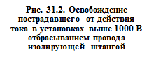 Если в установке напряжением более 1000 В и быстрое отключение невозможно, то пользоваться какими бы то ни было подручными средствами вроде палки, доски или сухой одежды нельзя. В этом случае необходимо надеть диэлектрические перчатки и боты и оттащить пострадавшего от частей установки, находящихся под напряжением, пользуясь изолирующими за щитными средствами, рассчитанными на это напряжение