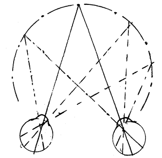 Рис. 5 При более углубленном исследовании выяснилось, что останавливает ребенка не глубина, а новизна ситуации, вызывающая ориентировочную реакцию и задержку движения. Аналогичный результат наблюдался, когда за пределами настила под стеклом помещали блестящую фольгу - ребенок также останавливался на границе двух разных поверхностей. Восприятие глубины и удаленности предметов осуществляется главным образом благодаря бинокулярному зрению. При бинокулярной фиксации дальних объектов (например, звезд на небе) зрительные линии обоих глаз параллельны. При этом изображения удаленных предметов видятся нами в одних и тех же местах пространства, независимо от того, падают ли эти изображения на сетчатку правого или левого глаза или обоих глаз. Следовательно, некоторым точкам сетчатки одного глаза соответствуют определенные точки сетчатки другого глаза. Эти симметрично расположенные точки сетчаток обоих глаз называются корреспондирующими точками. Корреспондирующие точки - такие точки сетчатки, которые совпали бы, если бы при наложении одной сетчатки на другую вертикальные и горизонтальные оси совместились. Возбуждение корреспондирующих точек сетчатки дает ощущение одного объекта в поле зрения. При каждом положении глаз корреспондирующим точкам сетчаток соответствуют строго определенные точки во внешнем пространстве. Графическое изображение точек пространства, обеспечивающих видение одного объекта при данном положении глаз, называется гороптером (рис. 6).