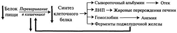 Белковая недостаточность является важнейшей проблемой питания. Бедно живущие семьи на фоне недостаточно калорийной пищи потребляют мало белка, в результате чего возникает синдром дистрофии, который называется квашиоркором. Богатая белком пища дорого стоит, поэтому не все слои населения могут ею постоянно питаться. Кваши-оркор у человека развивается при частичном (или полном) голодании и при потреблении неполноценных белков. Заболевание сопровождается нарушением функции кишечника, так как с надлежащей скоростью не синтезируются ферменты поджелудочной железы и не обновляются клетки его слизистой оболочки. Возникает порочный круг ква-шиоркора, характеризующийся прекращением процесса усвоения белка пищи. В организме развивается отрицательный азотистый баланс, нарушается водно-солевой обмен, появляется атония мышц и остановка роста. Пищевая дистрофия особенно опасна для младенцев. Ква-шиоркор может сопровождаться их гибелью от диареи, острых инфекций, заболеваний печени и отставанием в физическом и умственном развитии. Резкое снижение синтеза белка в печени на фоне недостаточного поступления его в организм уменьшает количество сывороточного альбумина, липопротеидов низкой плотности (ЛНП) и гемоглобина в крови (рис. 2.3). Наряду с общими нарушениями обмена аминокислот в организме существуют специфические изменения некоторых из них. Так,