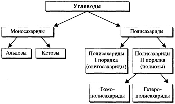 Моносахариды обычно содержат от 3 до 9 атомов углерода, причем наиболее распространены пентозы и гексозы. По функциональной группе они делятся на альдозы и кетозы. Моносахариды находятся обычно в таутомерном равновесии со своей циклической формой. Таутомерные циклические формы сахаров представляют собой внутренние полуацетали. В результате циклизации появляется новый асимметрический атом углерода, который называют гликозидным (или аномерным). Изомеры относительно аномерного центра называются α- и β-аномерами.