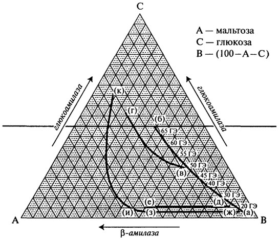 Глюкоамилаза α-(1,4)-глюканглюкогидролаза является экзоферментом, катализирующим последовательно отщепление концевых остатков α-D-глюкозы с нередуцирующего конца крахмальной цепи. Многие глюкоамилазы обладают способностью так же быстро, как и α-1,4-связь, гидролизовать α-1,6-глюкозидные связи. Но это происходит только в том случае, когда за α-1,6-связью следует α-1,4-связь, поэтому декстран ими не гидролизуется. Отличительной особенностью глюкоамилаз является способность в десятки раз быстрее гидролизовать высокополимеризованный субстрат, чем олиго- и дисахариды. Ферментативный гидролиз крахмала присутствует во многих пищевых технологиях как один из необходимых процессов, обеспечивающих качество конечного продукта – в хлебопечении (процесс тестоприготовления и выпечки хлеба), производстве пива (получение пивного сусла, сушка солода), кваса (получение квасных хлебцев), спирта (подготовка сырья для брожения), различных сахаристых крахмалопродуктов (глюкозы, патоки, сахарных сиропов). На рис. 3.9 представлен состав различных сахарных сиропов, полученных кислотно-ферментативным способом – предварительная обработка кислотой, а затем действием ферментов α-, β- и (или) глюкоамилазы. Использование такого комбинированного способа гидролиза крахмала открывает широкие возможности для получения сиропов заданного состава. Гидролиз сахарозы. Поскольку сахароза как сырье используется во многих производствах, необходимо учитывать ее исключительную способность к гидролизу. Это может иметь место при нагревании в присутствии небольшого количества пищевых кислот. Образующиеся при этом редуцирующие сахара (глюкоза, фруктоза) могут участвовать в реакциях дегидратации, карамелизации и меланоидинообразования, образуя окрашенные и ароматические вещества. В ряде случаев это может быть нежелательно. Ферментативный гидролиз сахарозы под действием β-фруктофуранозидазы (сахаразы, инвертазы) играет положительную роль в ряде пищевых технологий. При действии β-фруктофуранозидазы на сахарозу образуются глюкоза и фруктоза. Благодаря этому в кондитерских изделиях (в частности, в помадных конфетах) добавление β-фруктофуранозидазы предупреждает черствение конфет, в хлебопекарных изделиях – способствует улучшению аромата. Инверсия сахарозы под действием β-фруктофуранозидазы имеет место на начальной стадии производства виноградных вин. Инвертные сиропы, полученные действием β-фруктофуранозидазы на сахарозу, используются при производстве безалкогольных напитков.