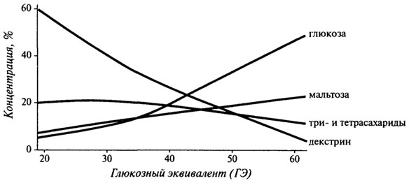 При получении сахарных сиропов из крахмала степень конверсии крахмала в D-глюкозу измеряют в единицах глюкозного эквивалента (ГЭ) – это содержание (в %) образующихся редуцирующих сахаров, выраженное в глюкозе на сухие вещества (СВ) сиропа. Гидролиз крахмала. 1. При гидролизе крахмала под действием кислот сначала имеет место ослабление и разрыв ассоциативных связей между макромолекулами амилозы и амилопектина. Это сопровождается нарушением структуры крахмальных зерен и образованием гомогенной массы. Далее идет разрыв α-D-(l,4)- и α-D-(1,6)-связей с присоединением по месту разрыва молекулы воды. В процессе гидролиза нарастает число свободных альдегидных групп, уменьшается степень полимеризации. По мере гидролиза и нарастания редуцирующих (восстанавливающих) веществ содержание декстринов уменьшается, глюкозы – увеличивается, концентрация мальтозы, три- и тетрасахаров сначала увеличивается, затем их количество снижается (см. рис. 3.5). Конечным продуктом гидролиза является глюкоза. На промежуточных стадиях образуются декстрины, три- и тетрасахара, мальтоза. Определенному значению глюкозного эквивалента соответствует определенное соотношение этих продуктов, и, варьируя длительностью гидролиза и условиями его проведения, можно получать различные соотношения отдельных продуктов гидролиза при той или иной величине глюкозного эквивалента.