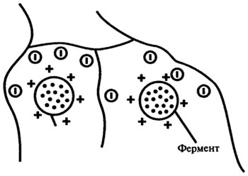 В различных пищевых технологиях долгое время применялись лишь препараты свободных ферментов, срок использования которых — один производственный цикл. Однако достижения молекулярной биологии, биохимии и энзимологии привели к тому, что в настоящее время строение и функции многих ферментов изучены очень детально и это позволило создать теоретическую базу для производства ферментов пролонгированного действия или иммобилизованных ферментов, т. е. фиксированных или связанных ферментных препаратов. Сущность иммобилизации ферментов заключается в присоединении их в активной форме тем или иным способом к инертной матрице (обычно это нерастворимый полимерный носитель). Иммобилизацию фермента можно определить и как включение молекулы фермента в какую-либо изолированную фазу, которая отделена от фазы свободного раствора, но способна обмениваться находящимися в ней молекулами субстрата, эффектора или кофактора. Фаза фермента обычно нерастворима в воде и часто представляет собой высокомолекулярный гидрофильный полимер, например, целлюлозу, полиакриламид, сефарозу и т. п. Принципы и способы иммобилизации. Включение фермента в изолированную фазу осуществляют различными способами: фермент может быть ко валентно связан с этой фазой, адсорбирован на ней или физически включен в нее. Возможны следующие способы иммобилизации фермента. 1. Ковалентное связывание. Молекула фермента ковалентно связывается с нерастворимым полимером. Полимер может быть в виде порошка или в форме пленки. Иногда молекулы фермента соединяются ковалентными связями друг с другом или с каким-либо инертным белком; при этом образуется нерастворимый, но активный полимерный фермент (рис. 8.11). 2. Электростатическое связывание. Этот способ иммобилизации основан на использовании электростатических или других нековалентных механизмов связывания (рис. 8.12). 3. Сополимеризация с помощью многофункциональных реагентов. Связывание молекул фермента с белками (например, с альбумином) или друг с другом осуществляется за счет использования определенных реагентов. В качестве такого многофункционального реагента часто используют глутаровый альдегид, гелеобразующее действие которого известно давно. В этом способе необходимо избегать взаимодействия реагента с активным центром фермента и ингибирования последнего (рис. 8.13).