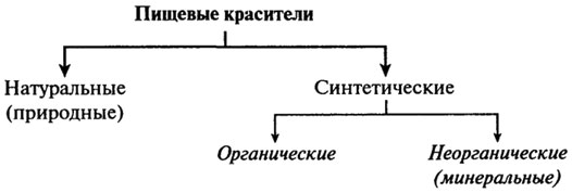 Пищевые красители Основной группой веществ, определяющих внешний вид продуктов питания, являются пищевые красители (функциональный класс 7, табл. 9.1). Потребитель давно привык к определенному цвету пищевых продуктов, связывая с ним их качество, поэтому красители в пищевой промышленности применяются с давних времен. В условиях современных пищевых технологий, включающих различные виды термической обработки (кипячение, стерилизацию, жарение и т. д.), а также при хранении продукты питания часто изменяют свою первоначальную, привычную для потребителя окраску, а иногда приобретают неэстетичный внешний вид, что делает их менее привлекательными, отрицательно влияет на аппетит и процесс пищеварения. Особенно сильно меняется цвет при консервировании овощей и фруктов. Как правило, это связано с превращением хлорофиллов в феофитин или с изменением цвета антоциановых красителей в результате изменения рН среды или образования комплексов с металлами. В то же время, красители иногда используются для фальсификации пищевых продуктов, например, подкрашивания их, не предусмотренного рецептурой и технологией, — для придания продукту свойств, позволяющих имитировать его высокое качество или повышенную ценность. Для окраски пищевых продуктов используют натуральные (природные) или синтетические (органические и неорганические) красители (рис. 9.3).