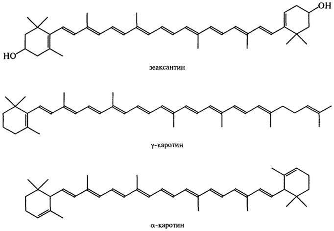 Большую группу составляют производные каротиноидов: флавоксантин (Е161 а), лютеин (экстракт бархатцев, Е161b), криптоксантин (Е161 с), рубиксантин (Е16Ы), виолоксантин (Е161е),родоксантин (E161f), кантак-сантин(Е160g). Для окраски пищевых продуктов (маргарина, сливочного масла, майонеза, рыбных изделий, искусственной икры и некоторых других продуктов) применяют каротиноиды, выделенные из моркови α-β-γ-каротины), плодов шиповника, перца, а также продукты, полученные микробиологическим или синтетическим путем. Каротиноиды устойчивы к изменению рН среды, к веществам, обладающим восстановительными свойствами, но при нагревании (выше 100°С) или под действием солнечного света легко окисляются. Наибольшее значение имеет β-каротин, экстракты натуральных каротинов и аннато.