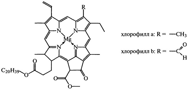 Хлорофиллы (магнийзамещенные производные порфирина) — природные пигменты, придающие зеленую окраску многим овощам и плодам (салат, зеленый лук, зеленый перец, укроп и т. д.). Хлорофилл состоит из сине-зеленого "хлорофилла а" и желто-зеленого "хлорофилла Ь", находящихся в соотношении 3:1. Для извлечения хлорофилла используют петролейный эфир со спиртом. Применение их в качестве красителя (Е140) в пищевой промышленности сдерживается их нестойкостью: при повышенной температуре в кислых средах зеленый цвет