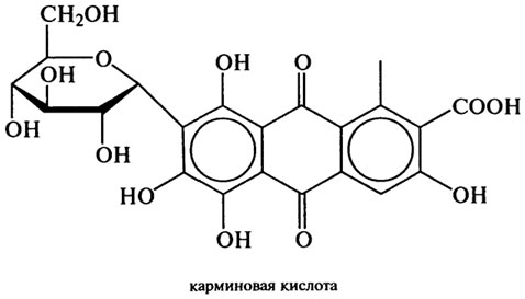 Антрахиноновые красители содержат в качестве основной хромофорной группы гидроксиантрахинон, обладающий стабильной окраской. К природным пигментам этой группы относятся ализарин, кармин, алканин. Остановимся на разрешенных в России. Кармин Е120 — красный краситель (основной компонент карминовая кислота) — представляют собой комплексные соли карминовой кислоты с ионами металлов. Получают экстракцией из кошениля — высушенных и растертых женских особей насекомых — червецов вида Dactylopius coccus (Sacta), обитающих на кактусах, которые произрастают в Южной Америке, Африке. Наиболее богаты кармином самки кошенили, содержащие до 3% красителя. Краситель устойчив к нагреванию, действию кислорода воздуха, свету. Применяется в кондитерской, безалкогольной, мясной промышленности, при производстве джемов, желе. В последнее время кармин в значительно больших количествах получают синтетическим путем.