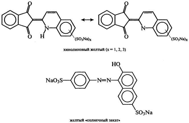 В качестве пищевых красителей применяются также хинолиновый желтый Е104, желтый 2G Е107, желтый "солнечный закат FCF" Е110, красные красители — азорубин (кармуазин) Е122, понсо 4R (пунцовый 4R) Е124, красный 2G Е128, "красный очаровательный AC" E129, "орсейл" (орсин-красный для карамели) Е182; голубые красители — "синий патентованный V" Е131, "синий блестящий FCF" E133; зеленые красители — "зеленый S" E142, "зеленый прочный FCF" E143; темно-фиолетовый краситель — "черный блестящий РН" (бриллиантовый черный) Е151; коричневый краситель "коричневый НТ" Е155.