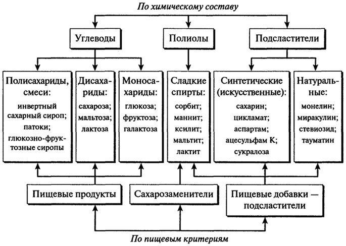 В пищевой промышленности, кулинарии, при приготовлении пищи в домашних условиях с давних времен широко применяются вещества, обладающие сладким вкусом, — подслащивающие вещества (подсластители). По строгому определению в этот раздел пищевых добавок (функциональный класс 22) попадают вещества несахарной природы, которые придают пищевым продуктам сладкий вкус, однако на практике в эту группу часто включают все сладкие добавки (ингредиенты). Существуют различные их классификации: по происхождению (натуральные и искусственные), калорийности (высококалорийные, низкокалорийные, практически некалорийные), степени сладости (подсластители с высоким или низким сахарным эквивалентом), по химическому составу и т. д. Одна из возможных классификаций приведена на рис. 9.8. Первыми из сладких веществ, употребляемых человеком, были мед, соки и плоды растений. Основное сладкое вещество, используемое нами, — сахароза.