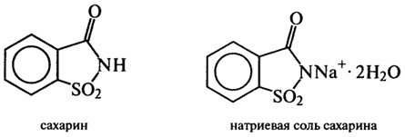 Соединения с приятным вкусом, без привкуса горечи, стабильны при варке, выпечке, хорошо растворимы в воде. Сладость в 30 раз выше, чем у сахарозы (Ксл 30). В ряде стран применяется в кондитерской промышленности, при производстве напитков и некоторых других пищевых продуктов. Цикламаты (были открыты в 1937 г. Сведой и Одристом в США) относятся к подсластителям "старого" поколения, улучшают вкус классического подсластителя сахарина (10 частей цикламата на 1 часть сахарина). Сахарин (натриевая, калиевая и кальциевая соли) Е954. Из синтетических подсластителей значительное применение находит сахарин— орто-сульфамид бензойной кислоты (белое кристаллическое вещество с температурой плавления 228—229°С), а также его натриевая, калиевая и кальциевая соли. Подсластитель "старого" поколения обладает "горьковатым" привкусом, это неудобство может быть устранено путем смешения с цикламатами.