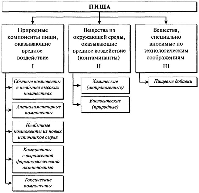 Чужеродные химические вещества (ЧХВ) могут попадать в пищу случайно в виде контаминантов-загрязнителей, например, из окружающей среды или в процессе технологической обработки при контакте с оборудованием; иногда их вводят специально в виде пищевых добавок, когда это связано с технологической необходимостью. Кроме того, в пищевом сырье и готовых продуктах питания могут содержаться природные компоненты, оказывающие вредное влияние на здоровье человека. В целом, классификация вредных и посторонних веществ в сырье, питьевой воде и продуктах питания может быть представлена в виде схемы (см. рис. 11.1).