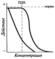 Токсичные элементы (в частности, некоторые тяжелые металлы) составляют обширную и весьма опасную в токсикологическом отношении группу веществ. Обычно рассматривают 14 элементов: Hg, Pb, Cd, As, Sb, Sn, Zn, Al, Be, Fe, Cu, Ba, Cr, Tl. Разумеется, не все перечисленные элементы являются ядовитыми, некоторые из них необходимы для нормальной жизнедеятельности человека и животных. Поэтому часто трудно провести четкую границу между биологически необходимыми и вредными для здоровья человека веществами. В большинстве случаев реализация того или иного эффекта зависит от концентрации. При повышении оптимальной физиологической концентрации элемента в организме может наступить интоксикация, а дефицит многих элементов в пище и воде может привести к достаточно тяжелым и трудно распознаваемым явлениям недостаточности. Зависимость вредного или полезного действия некоторых элементов от концентрации показана на рис. 11.3. Для веществ, относящихся к так называемым супертоксикантам, плато, характеризующее норму, отсутствует (или очень короткое), а крутизна нисходящей ветви характеризует токсичность вещества (рис. 11.4).