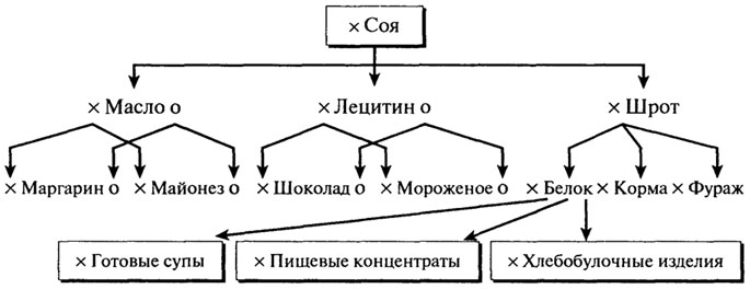 Генетически модифицированные (трансгенные) продукты питания представляют особый интерес. Сообщения о генетически модифицированных растениях и полученных из них продуктах питания появились в начале 90-х гг. В настоящее время генетическому изменению подвергается важнейшее растительное сырье, а без использования растительного сырья получают лишь очень немногие продукты. Успехи в области генной инженерии позволяют получать новые сорта растений (причем в течение всего 2-3 лет) с заданными свойствами. За счет встраивания генов, выделенных из одних организмов и несущих определенную генетическую информацию (например, устойчивость к заморозкам, гербицидам, болезням и паразитам, высокая урожайность, неполегаемость и др.) в ДНК других, были получены растения, которые называют трансгенными, т. е. с перемещенными генами. В США в настоящее время насчитывается более 150 наименований генетически измененных продуктов, а площади в разных странах, на которых произрастают трансгенные растения, составляют по разным оценкам от 10 до 25 млн га. Трансгенные растения выращивают в США, Канаде, Японии, Китае, Бразилии, Аргентине и многих других странах. Европейские государства занимают в этом отношении более жесткую позицию. По прогнозам мировой рынок трансгенных культур достигнет приблизительно 8 млрд долларов США к 2005 г. и 25 млрд долларов США к 2010 г. В настоящее время среди промышленно выращиваемых трансгенных растений доля устойчивых к гербицидам составляет 71%, устойчивых к вредителям - 22%, устойчивых одновременно и к гербицидам, и к вредителям - 7%, устойчивых к вирусным, бактериальным и грибным болезням - менее 1%. К трансгенным продуктам можно отнести генетически измененную сою, устойчивую к гербицидам. Как известно, соя используется для приготовления 30 000 пищевых продуктов: супов, детского питания, картофельных чипсов, маргарина, салатных соусов, рыбных консервов и др. Кроме сои, наибольшее распространение получили трансгенные помидоры, кукуруза, рис, картофель, клубника, а также генетически модифицированные дрожжи и ферментные препараты, полученные из трансгенных микроорганизмов. Известны ферментные препараты, полученные из генетически модифицированных микроорганизмов. Основными ферментными препаратами, полученными методами генной инженерии, являются: а-амилаза из В. stearothermophilus, экстрессированная в В. subtilis; а-амилаза В. megaterium, экстрессированная в В. subtilis; химозин А, полученный их штамма Е. coli К-12, содержащего ген телячьего прохимозина А. Кроме того, при производстве глюкозного сиропа из кукурузного крахмала применяются ферменты из генетически измененных бактерий. В Германии получены трансгенные пектиназы, используемые при производстве соков и вин. Генная инженерия находит применение и в животноводстве, влияя на рост и продуктивность сельскохозяйственных животных. Возможны различные подходы к оценке генетически измененного сырья и готовых пищевых продуктов из него. Это можно проиллюстрировать на примере трансгенной сои и продуктов ее переработки (рис. 11.10).