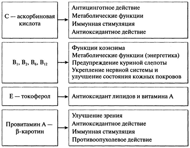 Витамины и антиоксиданты, к которым относятся витамины А, С, Е, витамины группы В и провитамин А - β-каротин, являясь функциональными ингредиентами, играют важную роль в позитивном питании. Они участвуют в метаболизме, укрепляют иммунную систему организма, помогают предупредить такие заболевания, как цинга и бери-бери. К антиоксидантам относятся β-каротин и витамины С и Е. Антиоксиданты замедляют процессы окисления ненасыщенных жирных кислот, входящих в состав липидов, путем взаимодействия с кислородом, а также разрушают уже образовавшиеся пероксиды. Действие пищевых антиоксидантов основано на их способности образовывать малоактивные радикалы, прерывая реакцию автоокисления по схеме: АН + R → А· + RH, А· + R· → AR (см. с. 451). Таким образом, антиоксиданты защищают организм человека от свободных радикалов, проявляя антиканцерогенное действие, а также блокируют активные перекисные радикалы, замедляя процесс старения. Функциональные свойства антиоксидантов и витаминов показаны на рис. 12.11.