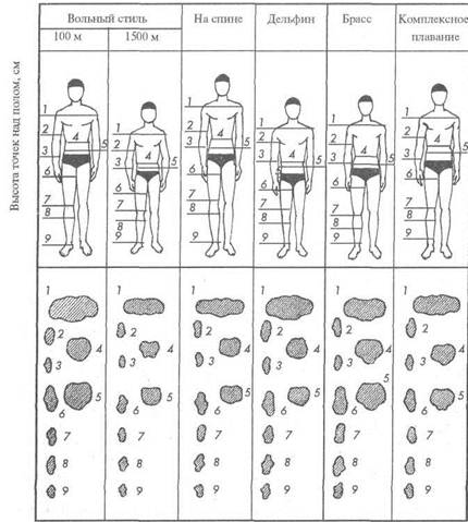 Целью спортивной тренировки обычно является достижение предельно возможных спортивных результатов, что обеспечивается оптимальным для данного спортсмена уровнем подготовленности. Спортивная подготовленность пловца включает техническую, физическую, психологическую и тактическую стороны, которые тесно взаимосвязаны и определяют скорость плавания. Чем выше уровень спортивной подготовленности пловца, тем выше его результаты. Спортивные достижения в плавании зависят также от особенностей телосложения. К настоящему времени сформировался специфический морфотип пловца, имеющего высокий рост (около 2 м), сглаженный рельеф мускулатуры (см. главу 2), высокие функциональные (ЖЕЛ до 9 000 см3) и силовые показатели, а также хорошую гибкость суставов. Различные способы плавания предъявляют особые требования к функциональным качествам и телосложению пловцов. Это отчетливо видно при сравнении морфофункциональных моделей пловцов (рис. 47). С увеличением длины основной дистанции уменьшаются все показатели тотальных размеров тела (длина, масса, обхват грудной клетки). Самыми высокорослыми обычно являются пловцы, специализирующиеся в плавании на спине и на спринтерских дистанциях (100-200 м) вольным стилем, самыми низкорослыми - брассисты, кролисты-стайеры (400-1500 м) и дельфинисты. Кролисты-спринтеры и дельфинисты имеют хорошо развитую мускулатуру, высокие показатели массы тела и силовые возможности. 1S7