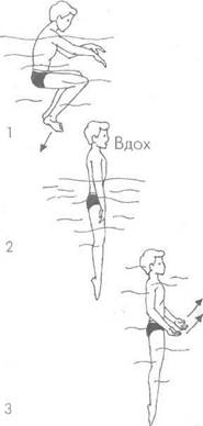 Рис. 72. Техника погружения вниз ногами быстрее он погрузится. Чтобы под водой погружение не замедлялось, гребковые движения руками надо выполнять снизу вверх. Когда пловец достигнет необходимой глубины или дна, он может сгруппироваться и, повернувшись, плыть в нужную сторону. Для погружения с поверхности воды вниз го/твой (рис. 73) пловец группируется (1), делает вдох и резким движением опускает голову под воду (2). вперед и разведя руки в стороны, чтобы движениями рук о воду затормозить погружение. Погружение с поверхности воды. Может выполняться вниз ногами или вниз головой. Для погружения с поверхности воды вниз ногами (рис. 72) необходимо сделать энергичный гребок обеими руками и ногами (1), приподняться как можно выше из воды и произвести вдох (2). Чем выше пловец поднимется из воды, тем