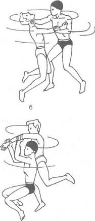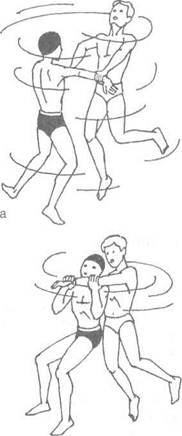 В наиболее сложных ситуациях, когда тонущий теряет самообладание и начинает судорожно цепляться за спасателя, тот может быстро погрузиться в воду, увлекая за собой тонущего и применяя соответствующий способ освобождения от захвата (рис. 79). Захват одной рукой за волосы. Спасатель одной рукой прижимает кисть тонущего, держащую его за волосы, а другой упирается в его локоть. Вращая руку в локтевом суставе, спасатель заводит ее за спину. Захват одной или двумя руками за запястье. Взявшись свободной рукой за кулак захваченной руки, спасатель делает резкое движение в сторону больших пальцев тонущего, упирается ногами ему в грудь и, оттолкнувшись, ныряет в глубину. Захват спереди двумя руками за оба запястья (рис. 79, а). Спасатель делает резкое движение руками в сторону больших пальцев тонущего, упирается ногами ему в грудь или плечи и, оттолкнувшись, уходит в глубину. Захват сзади двумя руками за оба запястья. Спасатель наклоняется вперед и группируется. Отводя назад вытянутые руки, он ставит стопы на живот или грудь тонущего и, оттолкнувшись, уходит вниз—вперед. Захват спереди пальцами за шею. Возможны три варианта освобождения: 1. Спасатель прижимает подбородок к груди и делает резкое 2. Спасатель прижимает подбородок к груди и выполняет кру 3. Спасатель прижимает подбородок к груди, упирается снизу Захват сзади пальцами за шею. Возможны два варианта действий: 1. Спасатель прижимает подбородок к груди, берется за мизин 2. Спасатель выполняет круговое движение своими сомкнуты Захват спереди или сзади руками за шею (рис. 79, в). Одной рукой удерживая кисть «верхней» руки тонущего, спасатель подни-