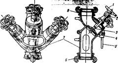 Рис. 1.21 Разветвление трехходовое РТ 1 — маховичок; 2 — уплотнитель сальниковый; 3—шпиндель; 4 — тарельчатый клапан; 5 — ручка; 6 — входной патрубок; 7— корпус; 8 — выходной патрубок Водосборник состоит из корпуса-тройника, двух входных соединительных головок для присоединения напорных или напорно-всасывающих рукавов и выходной соединительной головки для установки водосборника на всасывающем штуцере насоса. Внутри корпуса водосборника закреплен шарнирно-тарельчатый клапан для перекрывания одного входного патрубка при работе насоса от гидранта на один рукав.